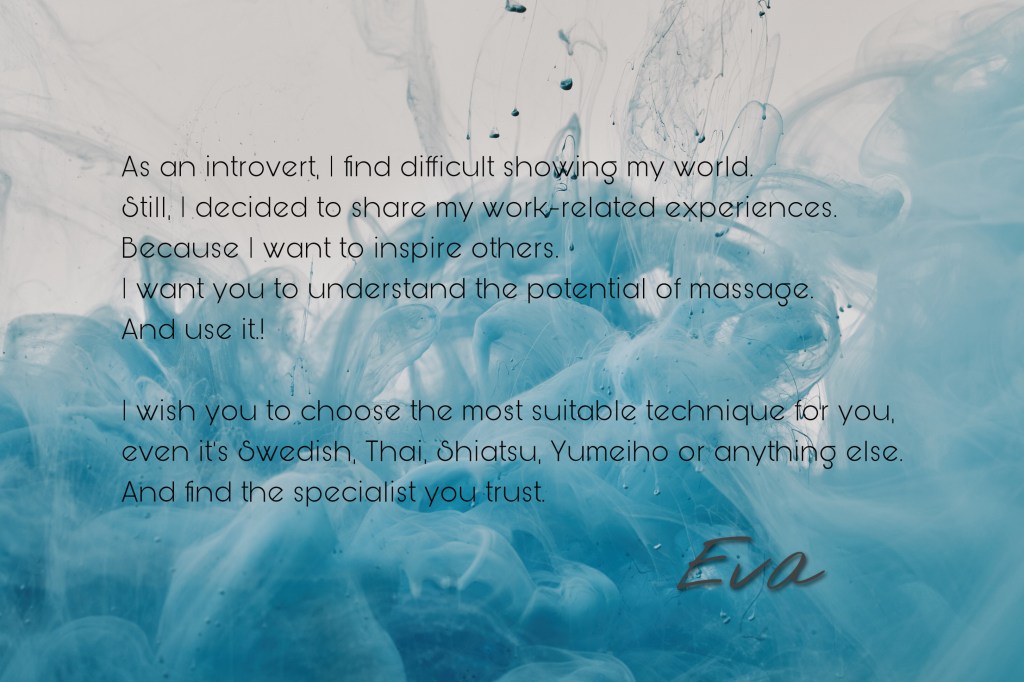 “You know, I wouldn’t came to massage therapy if that accident wouldn’t happened. The touching is so intimate connection for me.”