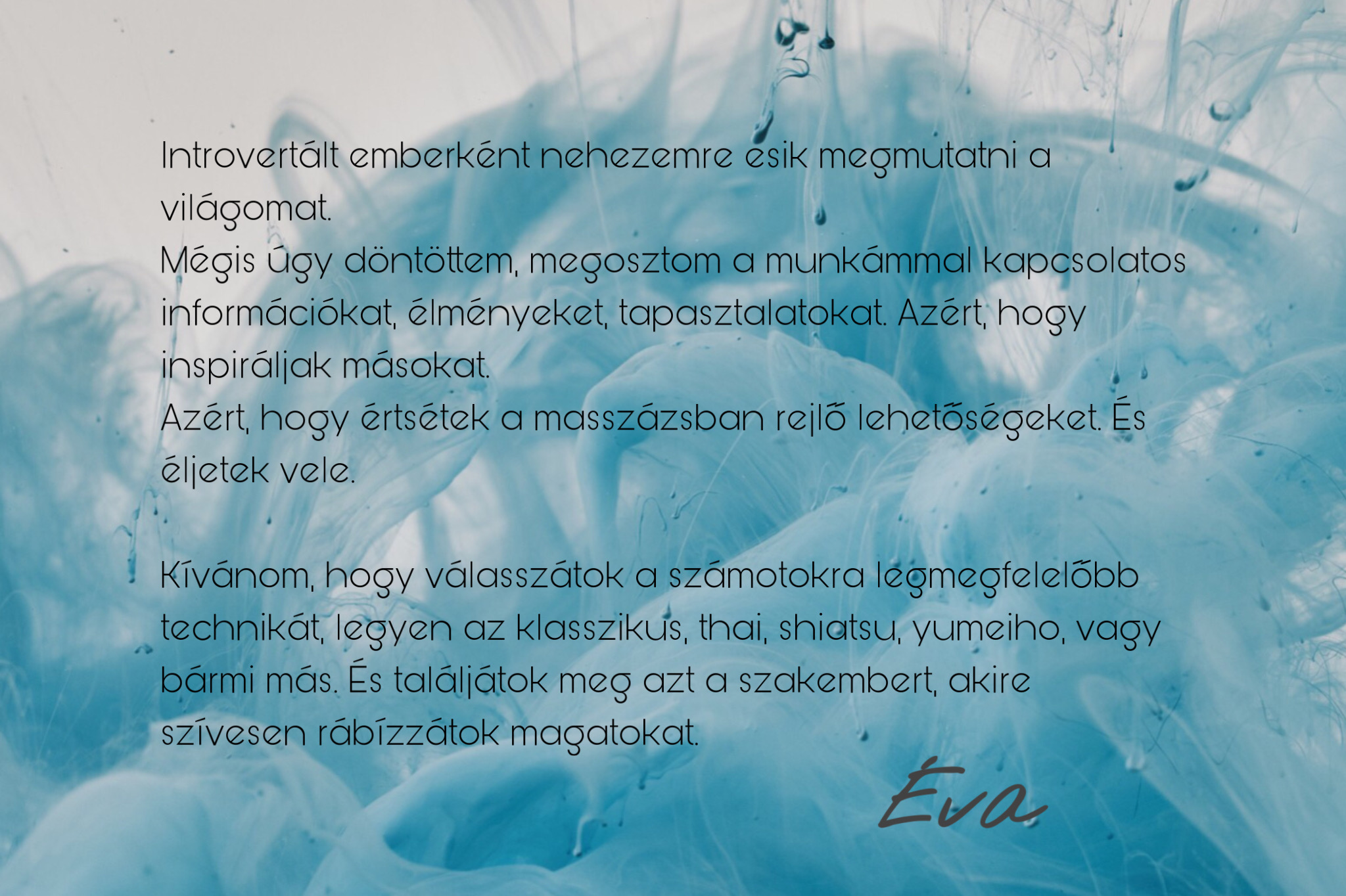 “Tudod, sosem jöttem volna masszázsra, ha nem történik velem ez a baleset. Az érintés annyira személyes dolog nekem.” Azt válaszoltam: ebben az esetben duplán köszönöm a bizalmat.